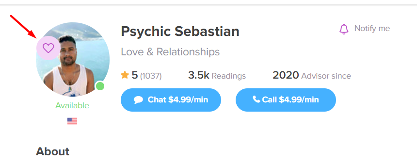 On the website, you’ll need to login first. Then, visit the advisor profile and click the heart icon, located in the photo of the advisor. Clicking the heart will add the advisor to your list.